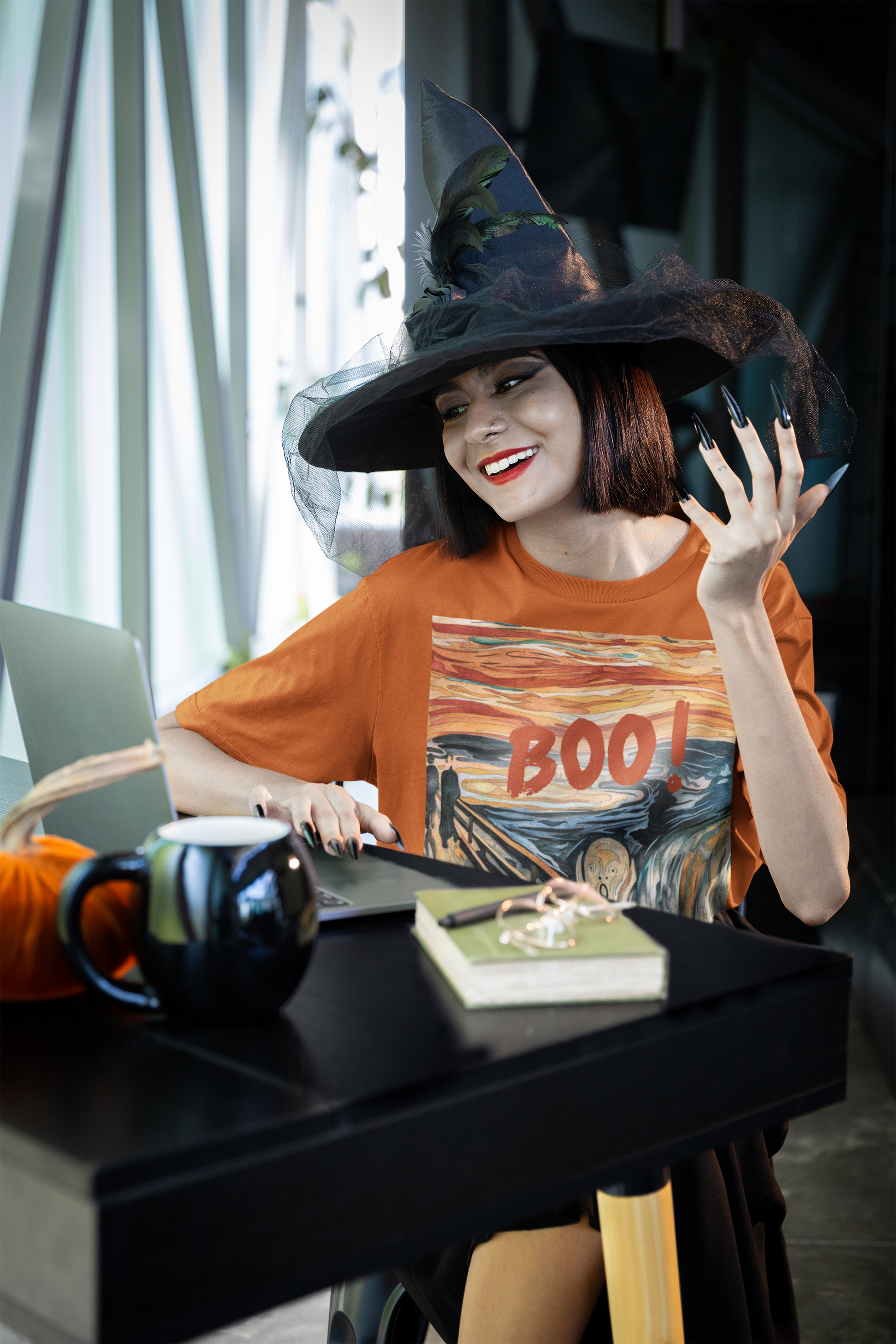 Get ready to make a statement with our Scream x BOO! T-Shirt, where Edvard Munch’s 1893 masterpiece "The Scream" meets a modern, playful twist. This legendary artwork, known for capturing existential dread and raw emotion, now features the bold, neon "BOO!" statement—turning an iconic moment of anguish into an edgy, eye-catching design.